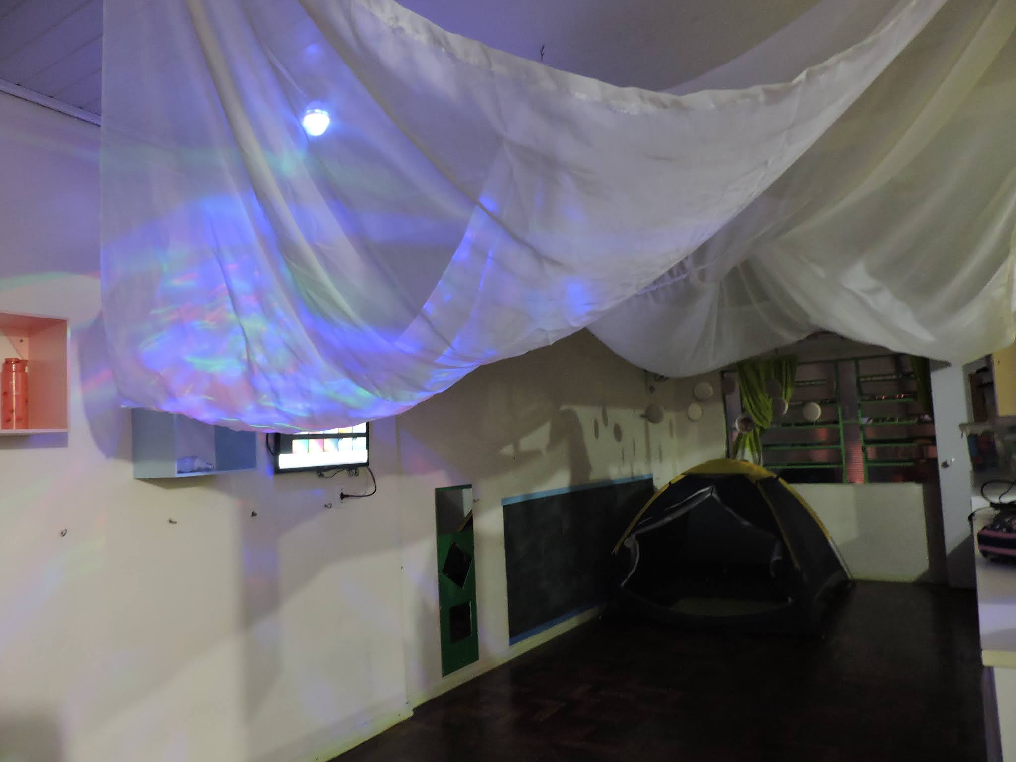 coloridas: a sala foi preparada com voal pendurado pela